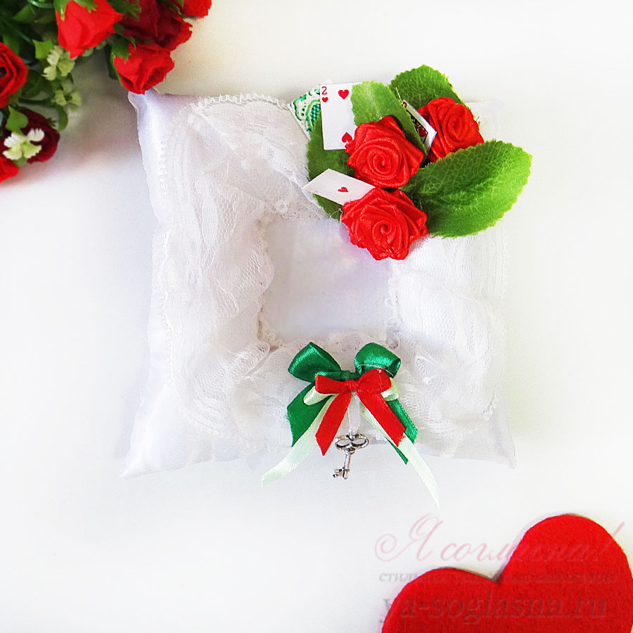 Особое очарование подушечке придают красные розы, миниатюрные карты и, конечно, подвеска в виде небольшого декоративного ключика.