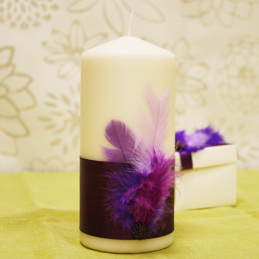Свадебная свеча украшена широкой атласной лентой насыщенного фиолетового цвета и перьями в лилово-фиолетовой гамме.